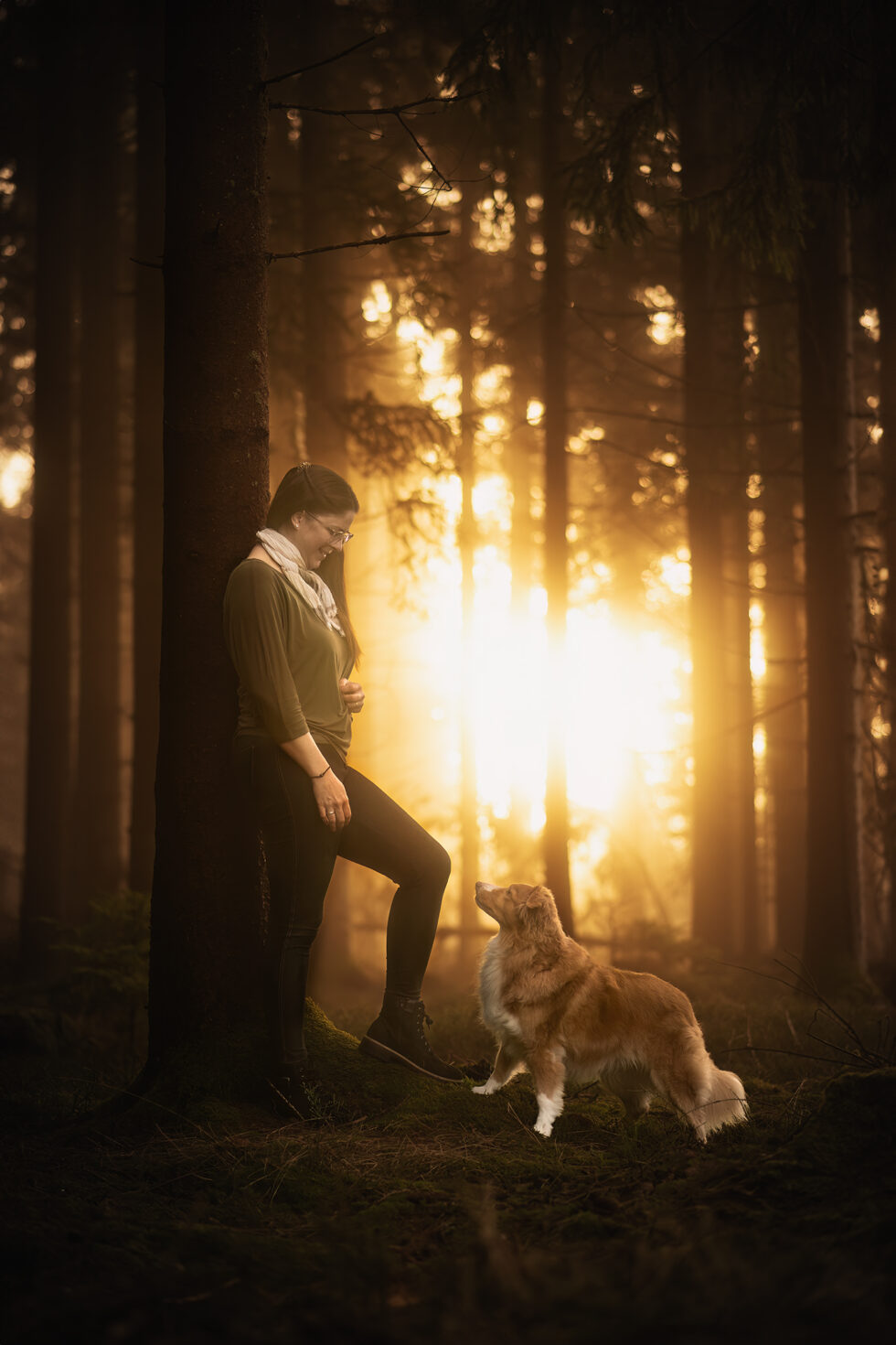 Der Wald in Hellmonsödt wirkt je nach Lichtstimmung mystisch, geheimnisvoll oder magisch. Besonders am frühen Morgen, wenn die ersten Sonnenstrahlen durch die hohen Bäume brechen oder Nebel über dem Boden liegt, entsteht hier eine einmalige Atmosphäre für emotionale Portraits und stimmungsvolle Bilder von dir und deinem Hund.