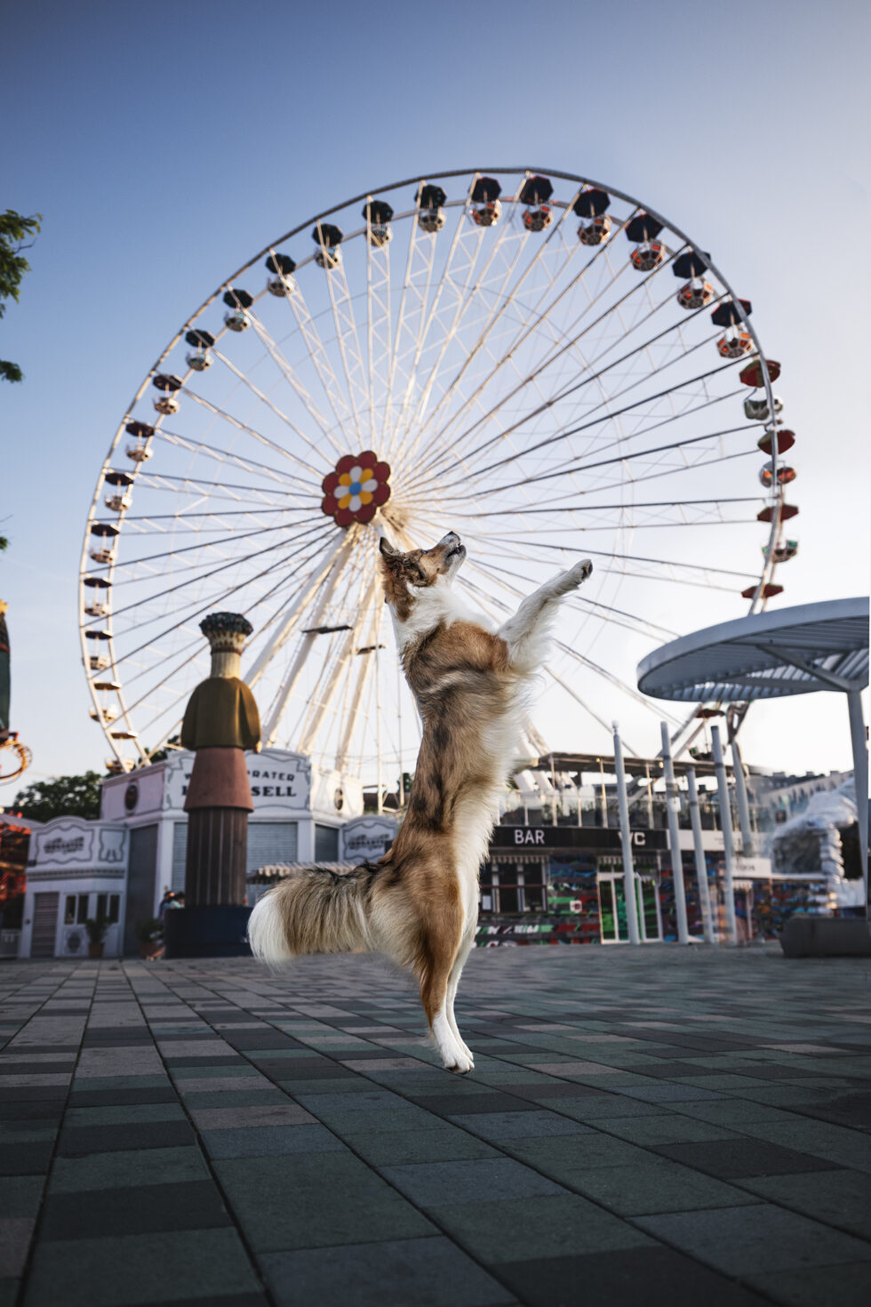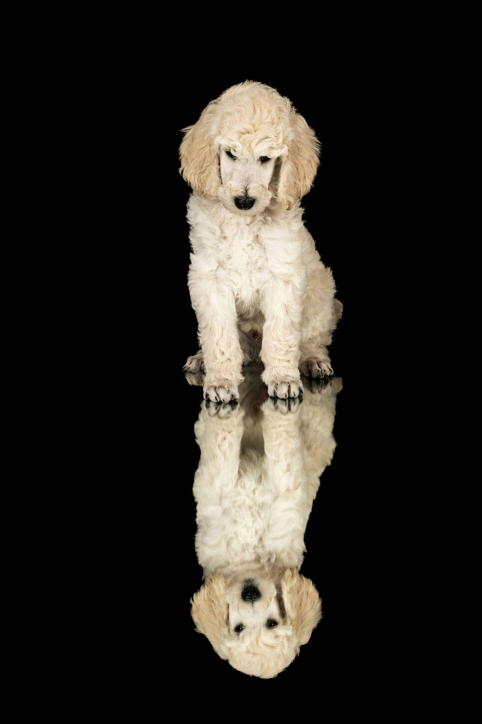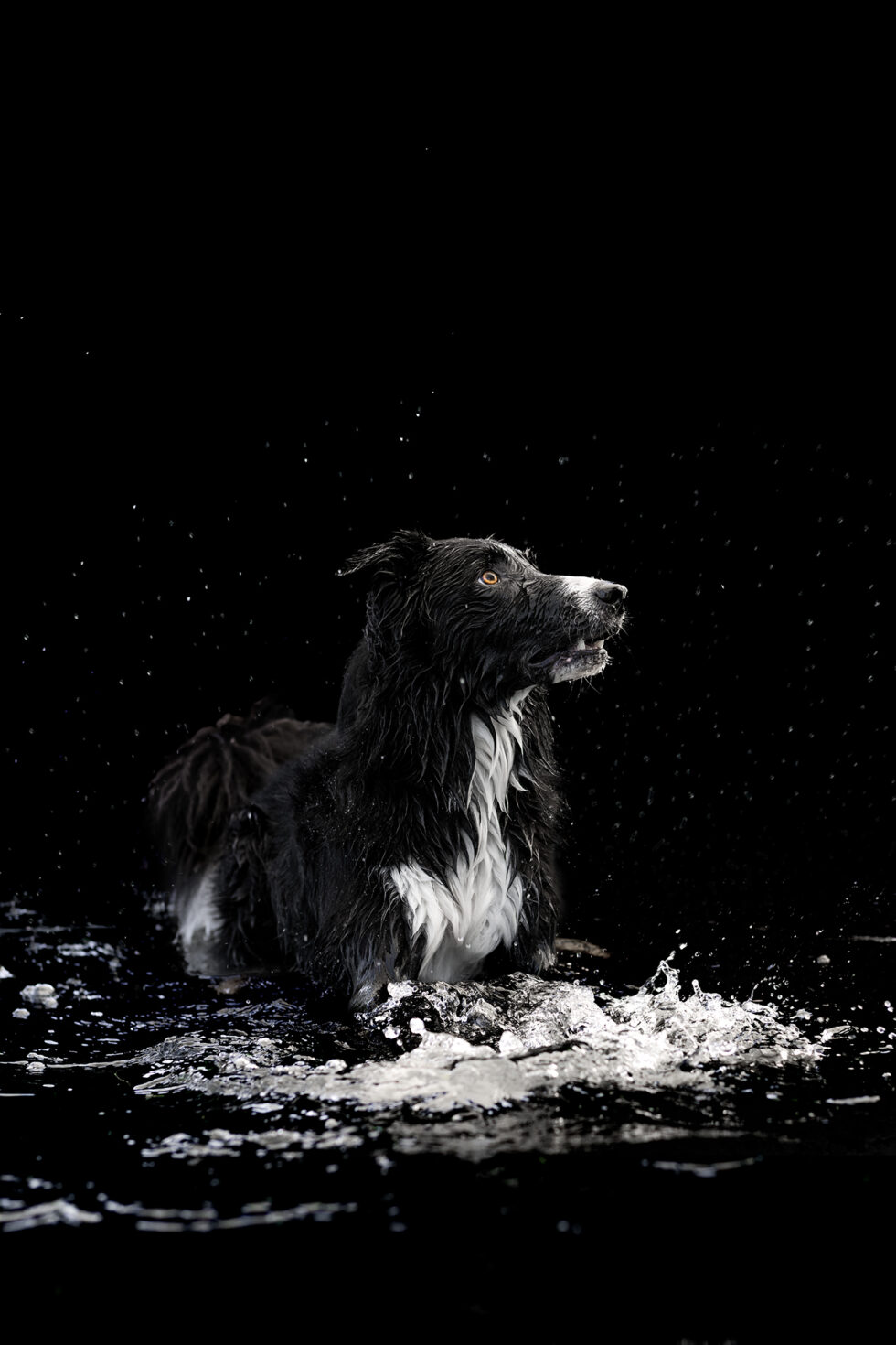 In meinem Wasserstudio entstehen sowohl Action- als auch Porträtfotos mit Spiegelbildern. Durch den schwarzen Hintergrund lenkt nichts vom Motiv ab, und die Wassertropfen kommen besonders zur Geltung. Die Kombination aus Wasser, Licht und Bewegung erzeugt faszinierende Spiegelungen und dynamische Effekte, die deinen Hund in einzigartiger Weise präsentieren.